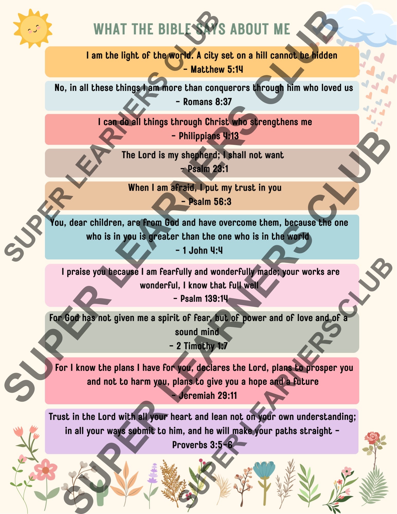 Speak life over your child—every single day. This joyful, pastel-colored “What the Bible Says About Me” poster gathers 10 powerful Bible verses that help kids build a strong identity in Christ and face each day with courage and joy. With a friendly sun, clouds, and flowers, the design is calm, kid-approved, and easy to read—perfect for bedrooms, playrooms, classrooms, and Sunday school.